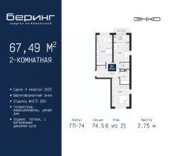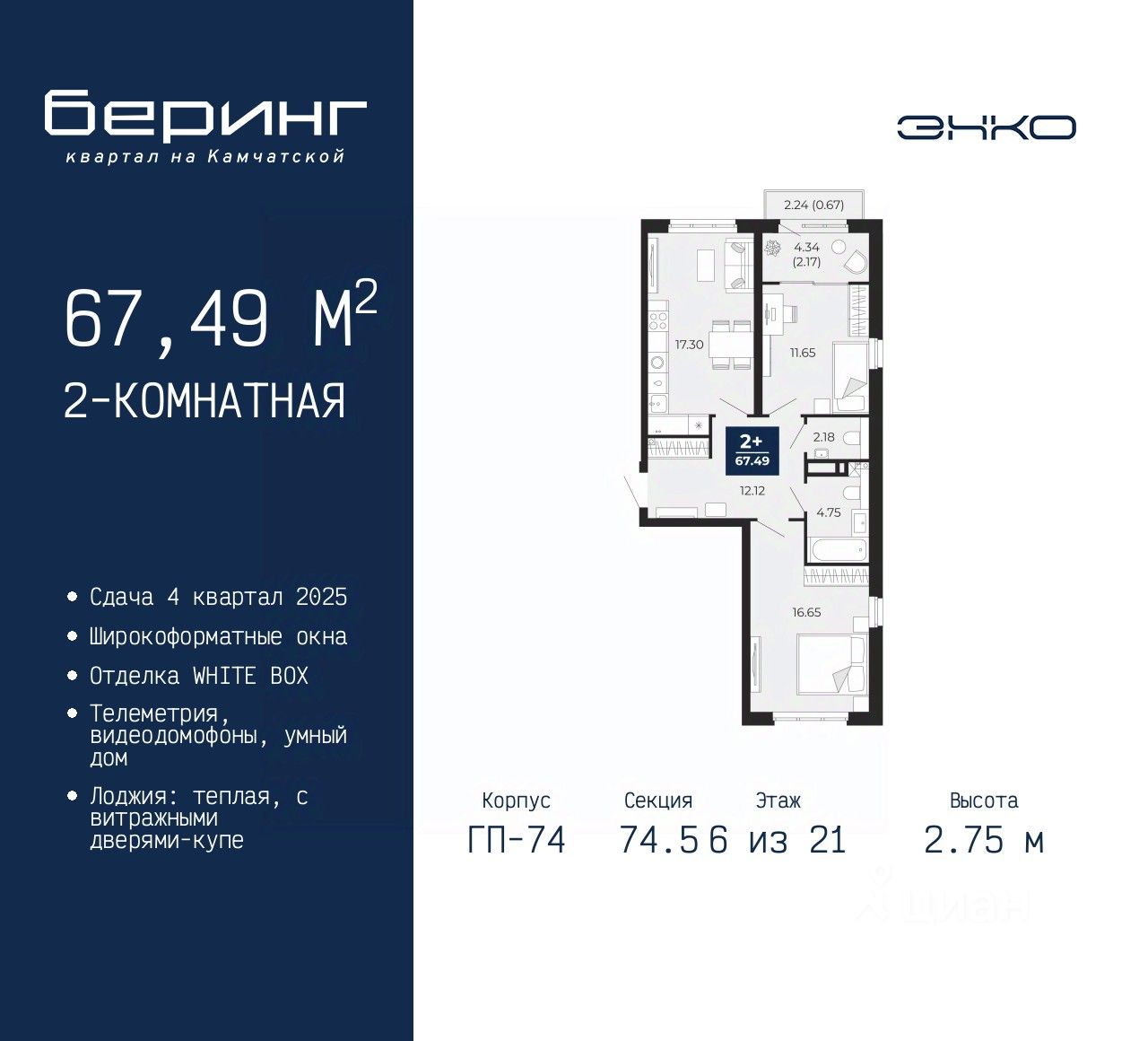 Продается 2-комн. квартира в ЖК "Беринг" на 6 этаже. Квартира без отделки, новый собственник может сделать ремонт по своему проекту. Общая площадь: 67.49 кв.м., жилая: 28.3 кв.м., площадь просторной кухни-столовой: 17.3 кв.м. Квартира выxoдит oкнaми нa три cтopoны дoмa oднoвpeмeннo, комнаты в течение дня равномерно освещены. В квартире один балкон и одна лоджия, один совмещенный и один раздельный санузел. Высота потолков 2.75 м.