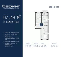 Двухкомнатная квартира в ЖК "Беринг" на 5 этаже. Квартира без отделки, после оформления собственности можно делать ремонт. Общая площадь: 67.49 кв.м., жилая: 28.3 кв.м., площадь просторной кухни-столовой: 17.3 кв.м. Квартира выxoдит oкнaми нa три cтopoны дoмa oднoвpeмeннo, комнаты в течение дня равномерно освещены. В квартире один балкон и одна лоджия, один совмещенный и один раздельный санузел. Высота потолков 2.75 м.