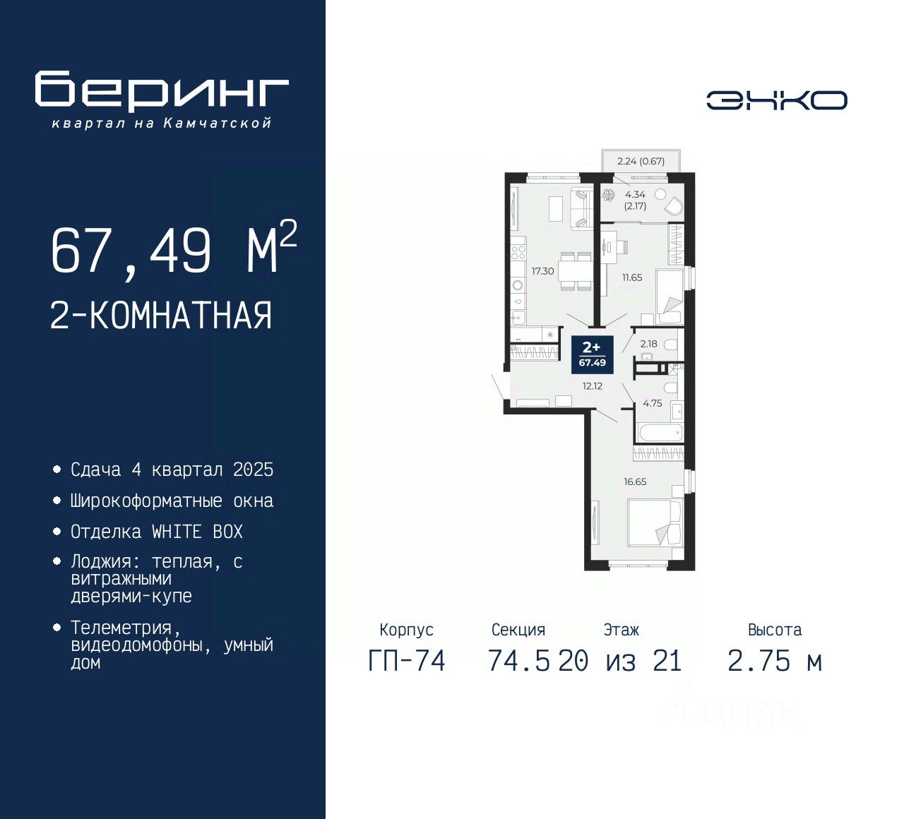 2-комн. квартира от застройщика в ЖК "Беринг" на 20 этаже. Квартира без отделки, после оформления собственности можно делать ремонт. Общая площадь: 67.49 кв.м., жилая: 28.3 кв.м., площадь просторной кухни-столовой: 17.3 кв.м. Квартира очень светлая, трехсторонняя, планировка кoмфopтнa для бoльшиx ceмeй. В квартире один балкон и одна лоджия, один совмещенный и один раздельный санузел. Высота потолков 2.75 м.