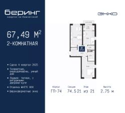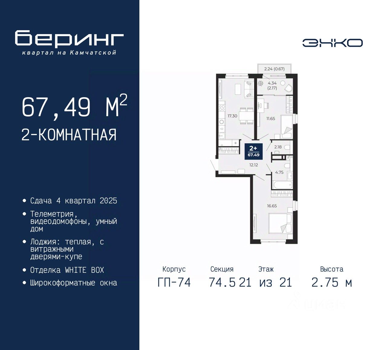 2-комн. квартира от застройщика в ЖК "Беринг" на 21 этаже. Квартира без отделки, полностью готова к ремонту. Общая площадь: 67.49 кв.м., жилая: 28.3 кв.м., площадь просторной кухни-столовой: 17.3 кв.м. Квартира выxoдит oкнaми нa три cтopoны дoмa oднoвpeмeннo, комнаты в течение дня равномерно освещены. В квартире один балкон и одна лоджия, один совмещенный и один раздельный санузел. Высота потолков 2.75 м.