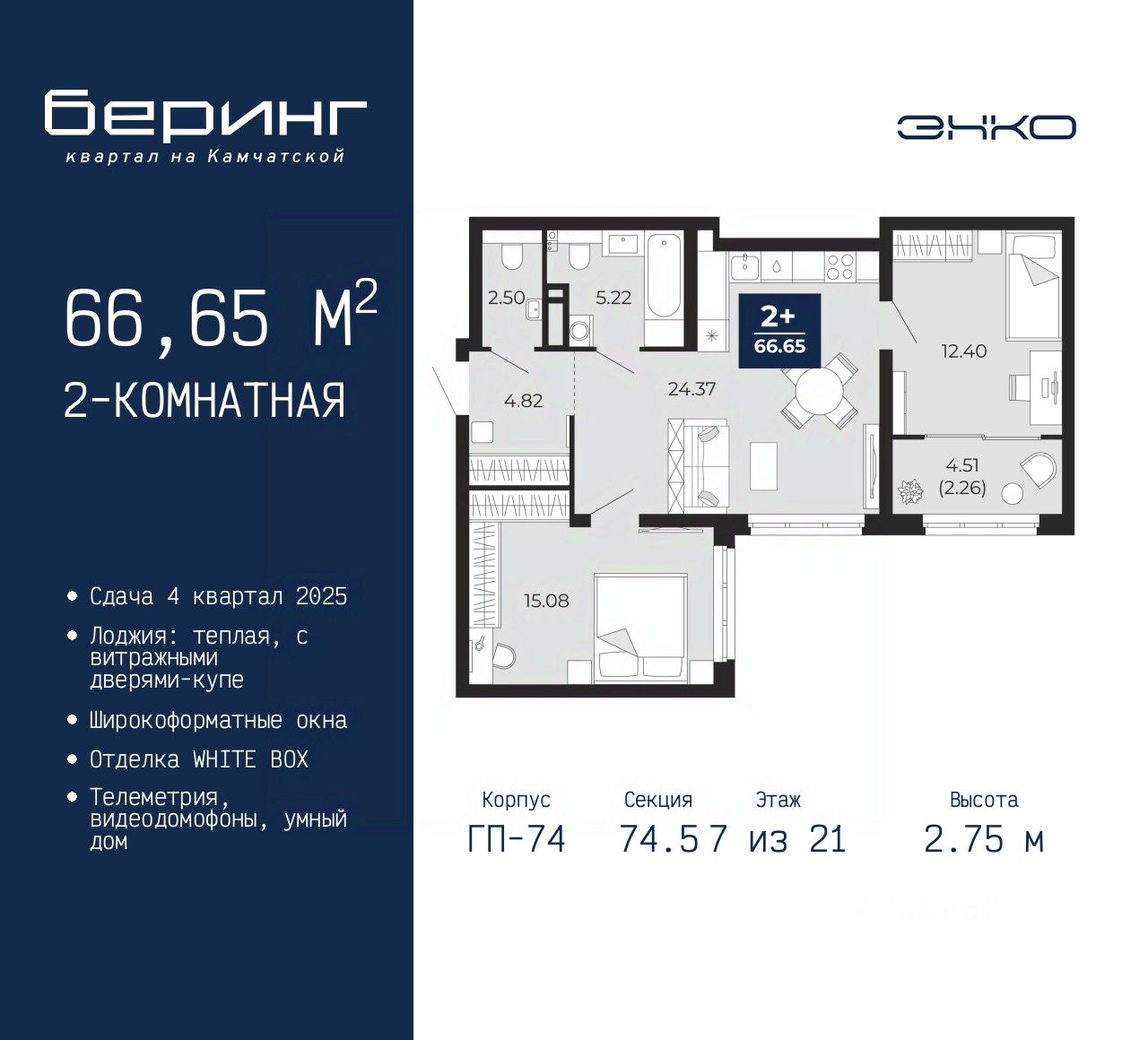 Продается 2-комн. квартира в ЖК "Беринг" на 7 этаже. Квартира без отделки, новый собственник может сделать ремонт по индивидуальному проекту. Общая площадь: 66.65 кв.м., жилая: 27.48 кв.м., площадь просторной кухни-столовой: 24.37 кв.м. Угловая квартира, идеально подойдет любителям тишины и панорамных видов. В квартире одна лоджия, один совмещенный и один раздельный санузел. Высота потолков 2.75 м.