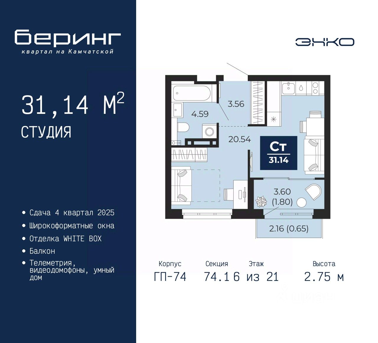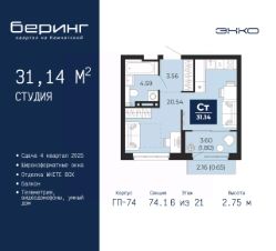 1-комн. квартира-студия в ЖК "Беринг" на 6 этаже. Квартира без отделки, новый собственник может сделать ремонт по своему проекту. Общая площадь: 31.14 кв.м., площадь гостиной 20.54 кв.м., из которых 5 кв.м. выделено под кухонную зону. Все окна выходят на одну сторону. В квартире один балкон, один совмещенный санузел. Высота потолков 2.75 м.