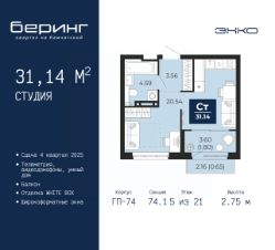 Однокомнатная квартира-студия от застройщика в ЖК "Беринг" на 5 этаже. Квартира без отделки, полностью готова к чистовой отделке и дальнейшему ремонту. Общая площадь: 31.14 кв.м., площадь гостиной 20.54 кв.м., из которых 5 кв.м. выделено под кухонную зону. Все окна выходят на одну сторону. В квартире один балкон, один совмещенный санузел. Высота потолков 2.75 м.