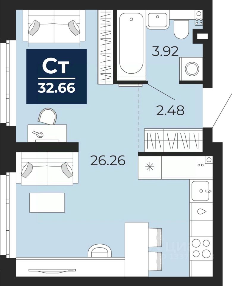 Просторная однокомнатная квартира-студия в ЖК "Беринг" на 1 этаже. Квартира без отделки, после выдачи ключей можно делать ремонт. Общая площадь: 32.66 кв.м., площадь гостиной 26.26 кв.м., из которых 5 кв.м. выделено под кухонную зону. Все окна выходят на одну сторону. В квартире один совмещенный санузел. Высота потолков 2.75 м.