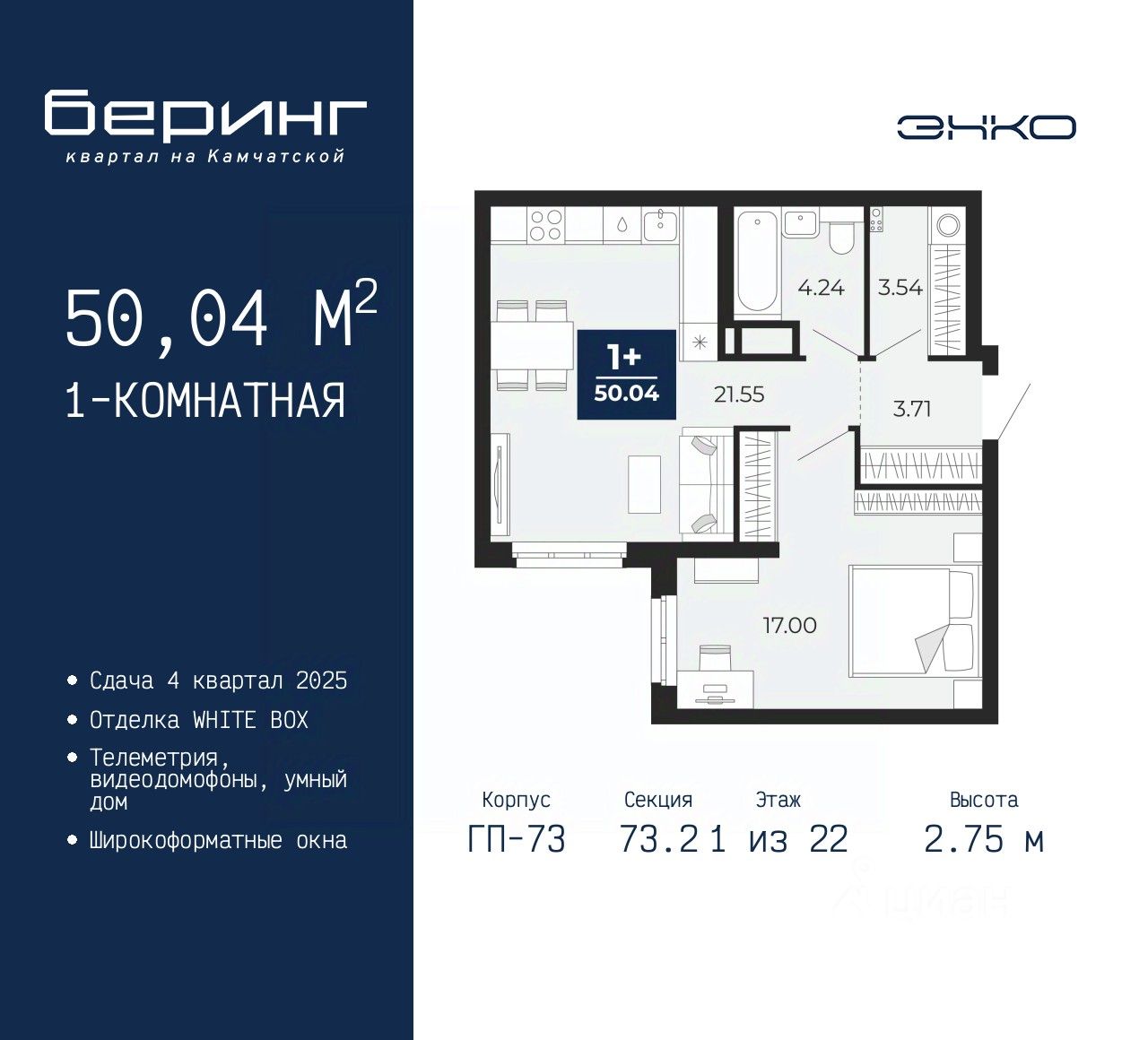 Продается однокомнатная квартира от застройщика в ЖК "Беринг" на 1 этаже. Квартира без отделки, после оформления собственности можно делать ремонт. Общая площадь: 50.04 кв.м., жилая: 17 кв.м., площадь просторной кухни-столовой: 21.55 кв.м. Угловая квартира, идеально подойдет любителям тишины и панорамных видов. В квартире один совмещенный санузел. Высота потолков 2.75 м.