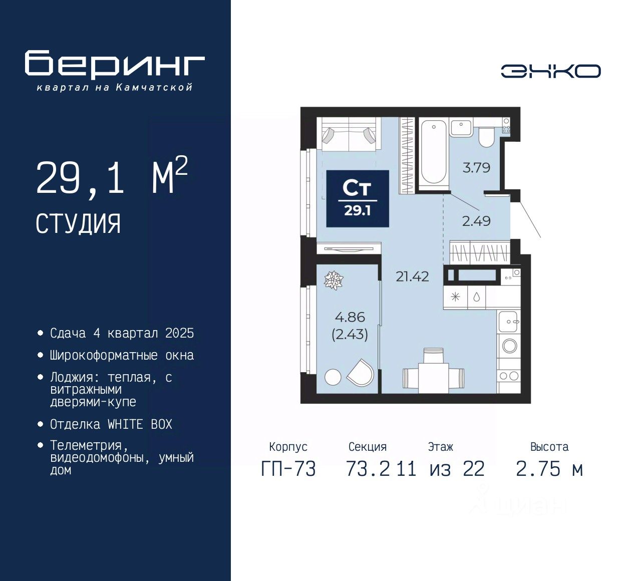 Продается однокомнатная квартира-студия в ЖК "Беринг" на 11 этаже. Квартира без отделки, полностью готова к ремонту. Общая площадь: 29.1 кв.м., площадь гостиной 21.42 кв.м., из которых 5 кв.м. выделено под кухонную зону. Все окна выходят на одну сторону. В квартире одна лоджия, один совмещенный санузел. Высота потолков 2.75 м.