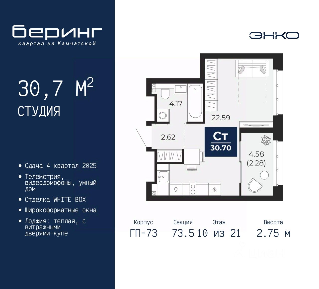 Продается однокомнатная квартира-студия в ЖК "Беринг" на 10 этаже. Квартира без отделки, после получения ключей можно делать ремонт. Общая площадь: 30.7 кв.м., площадь гостиной 21.36 кв.м., из которых 5 кв.м. выделено под кухонную зону. Все окна выходят на одну сторону. В квартире одна лоджия, один совмещенный санузел. Высота потолков 2.75 м.