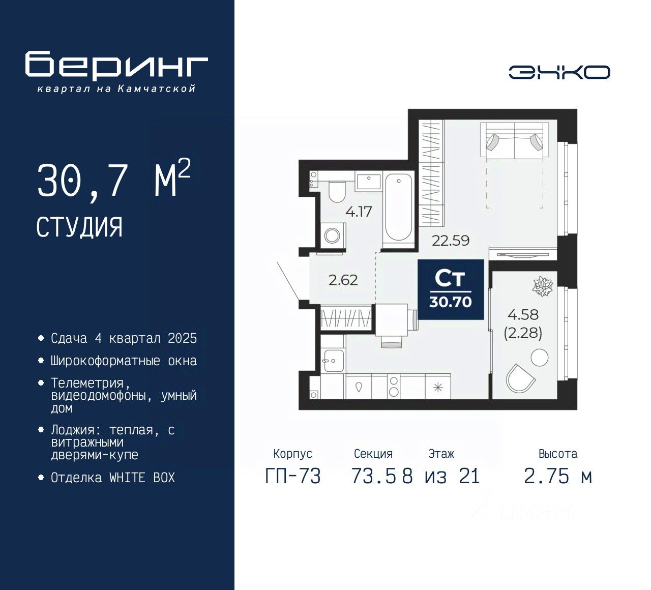 Продается однокомнатная квартира-студия в ЖК "Беринг" на 8 этаже. Квартира без отделки, после оформления собственности можно делать ремонт. Общая площадь: 30.7 кв.м., площадь гостиной 21.36 кв.м., из которых 5 кв.м. выделено под кухонную зону. Все окна выходят на одну сторону. В квартире одна лоджия, один совмещенный санузел. Высота потолков 2.75 м.