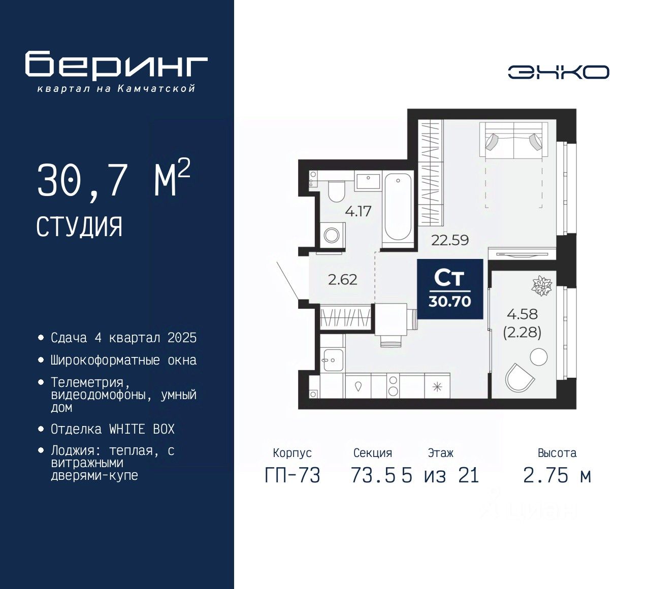 Продается 1-комн. квартира-студия от застройщика в ЖК "Беринг" на 5 этаже. Квартира без отделки, после оформления собственности можно делать ремонт. Общая площадь: 30.7 кв.м., площадь гостиной 21.36 кв.м., из которых 5 кв.м. выделено под кухонную зону. Все окна выходят на одну сторону. В квартире одна лоджия, один совмещенный санузел. Высота потолков 2.75 м.