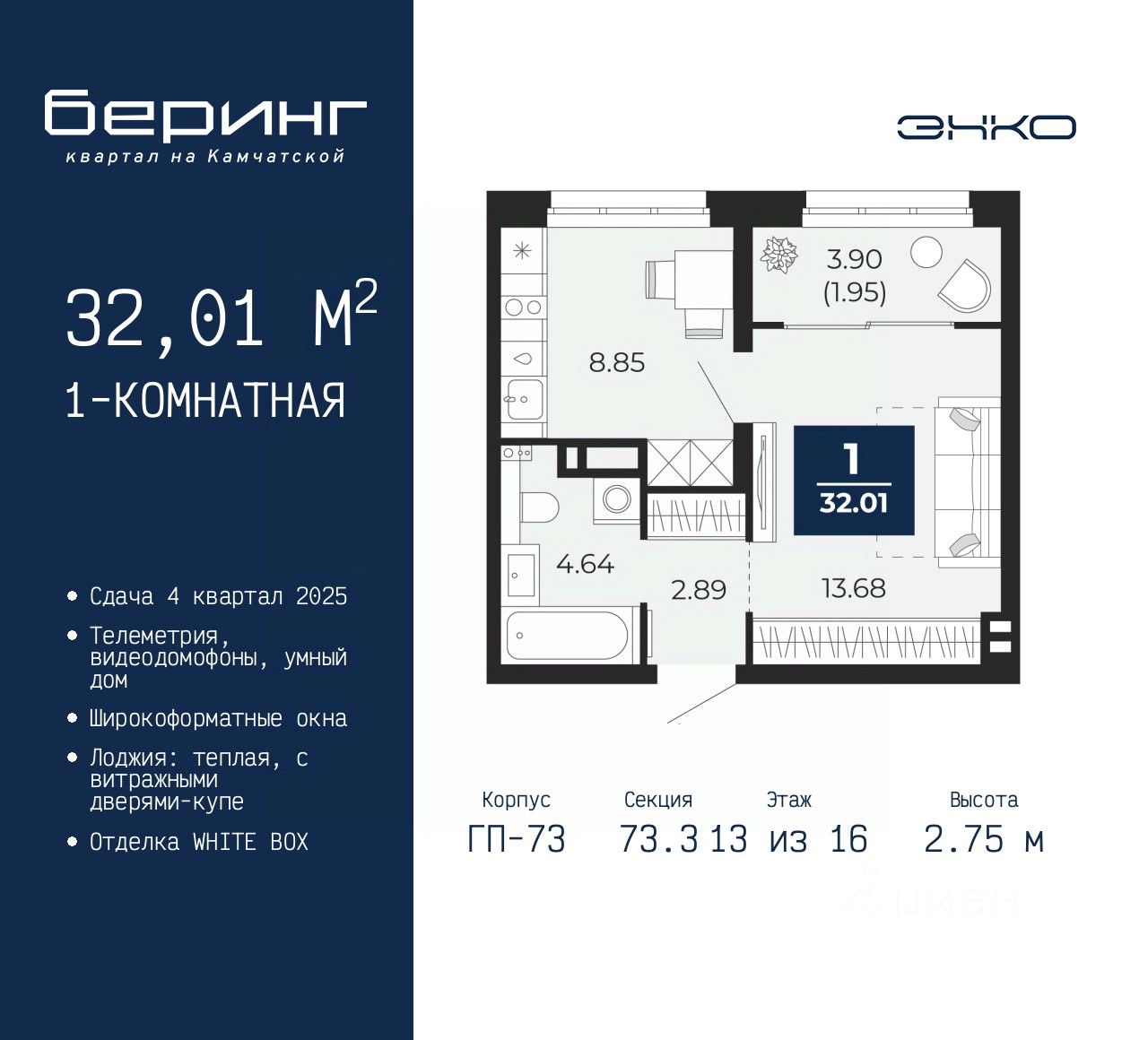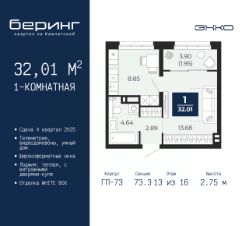 Просторная однокомнатная квартира в ЖК "Беринг" на 13 этаже. Квартира без отделки, после получения ключей можно делать ремонт. Общая площадь: 32.01 кв.м., жилая: 13.68 кв.м., площадь кухни: 8.85 кв.м. Все окна выходят на одну сторону. В квартире одна лоджия, один совмещенный санузел. Высота потолков 2.75 м.