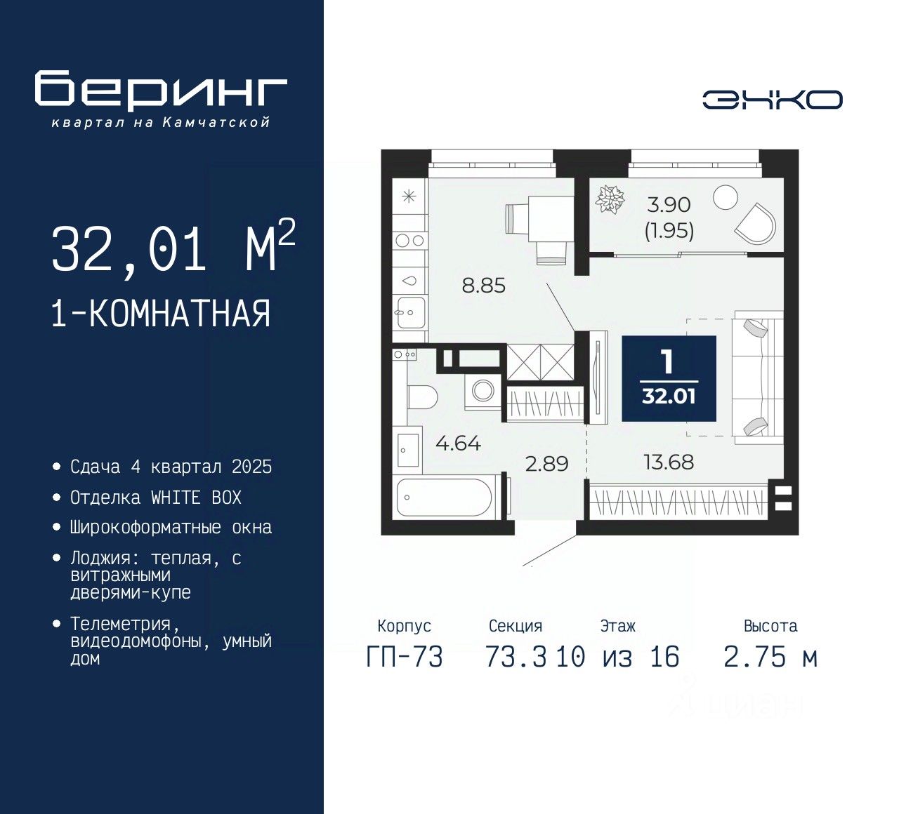 1-комн. квартира в ЖК "Беринг" на 10 этаже. Квартира без отделки, после оформления собственности можно делать ремонт. Общая площадь: 32.01 кв.м., жилая: 13.68 кв.м., площадь кухни: 8.85 кв.м. Все окна выходят на одну сторону. В квартире одна лоджия, один совмещенный санузел. Высота потолков 2.75 м.