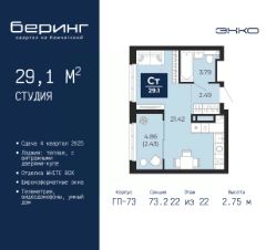 Просторная однокомнатная квартира-студия в ЖК "Беринг" на 22 этаже. Квартира без отделки, новый собственник может сделать ремонт по индивидуальному проекту. Общая площадь: 29.1 кв.м., площадь гостиной 21.42 кв.м., из которых 5 кв.м. выделено под кухонную зону. Все окна выходят на одну сторону. В квартире одна лоджия, один совмещенный санузел. Высота потолков 2.75 м.