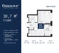 1-комн. квартира-студия в ЖК "Беринг" на 21 этаже. Квартира без отделки, после выдачи ключей можно делать ремонт. Общая площадь: 30.7 кв.м., площадь гостиной 21.36 кв.м., из которых 5 кв.м. выделено под кухонную зону. Все окна выходят на одну сторону. В квартире одна лоджия, один совмещенный санузел. Высота потолков 2.75 м.