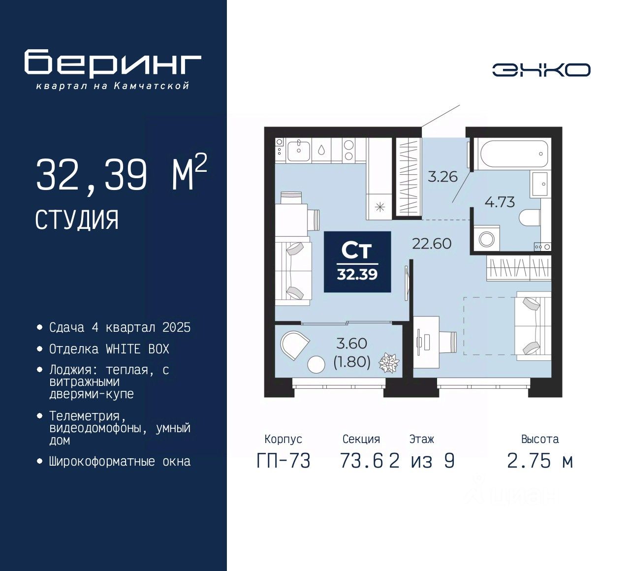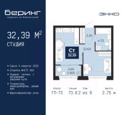1-комн. квартира-студия в ЖК "Беринг" на 2 этаже. Квартира без отделки, после получения ключей можно делать ремонт. Общая площадь: 32.39 кв.м., площадь гостиной 22.6 кв.м., из которых 5 кв.м. выделено под кухонную зону. Все окна выходят на одну сторону. В квартире одна лоджия, один совмещенный санузел. Высота потолков 2.75 м.