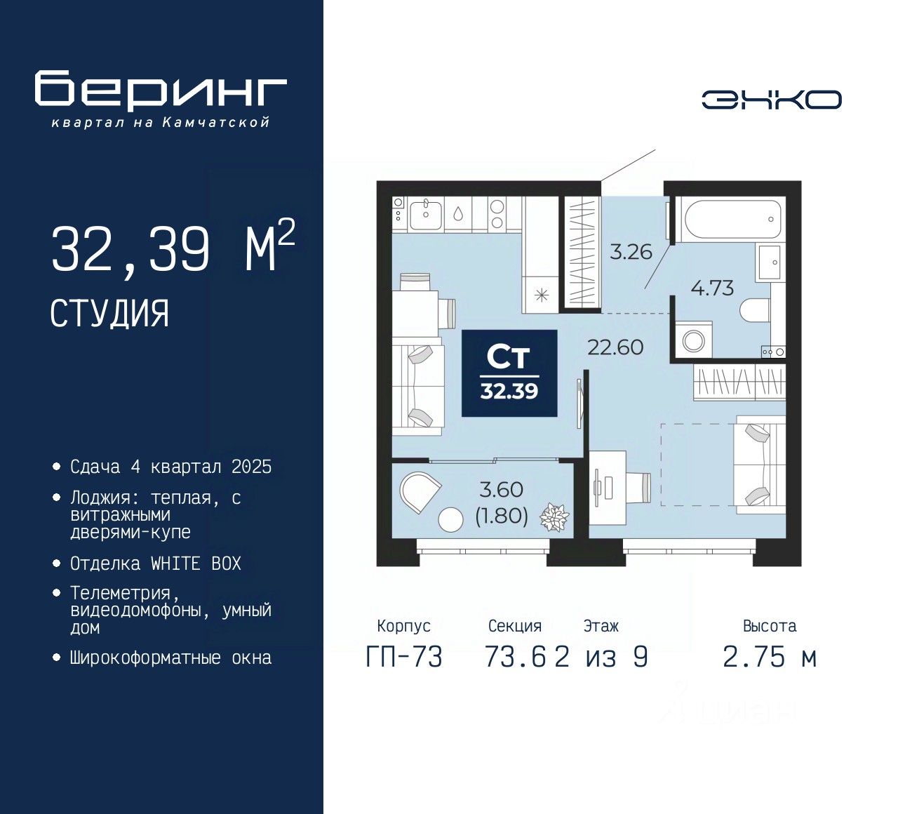 Однокомнатная квартира-студия в ЖК "Беринг" на 2 этаже. Квартира без отделки, после оформления собственности можно делать ремонт. Общая площадь: 32.39 кв.м., площадь гостиной 22.6 кв.м., из которых 5 кв.м. выделено под кухонную зону. Все окна выходят на одну сторону. В квартире одна лоджия, один совмещенный санузел. Высота потолков 2.75 м.