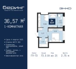 Продается однокомнатная квартира от застройщика в ЖК "Беринг" на 10 этаже. Квартира без отделки, после выдачи ключей можно делать ремонт. Общая площадь: 36.57 кв.м., жилая: 10.91 кв.м., площадь просторной кухни-столовой: 13.96 кв.м. Все окна выходят на одну сторону. В квартире одна лоджия, один совмещенный санузел. Высота потолков 2.75 м.