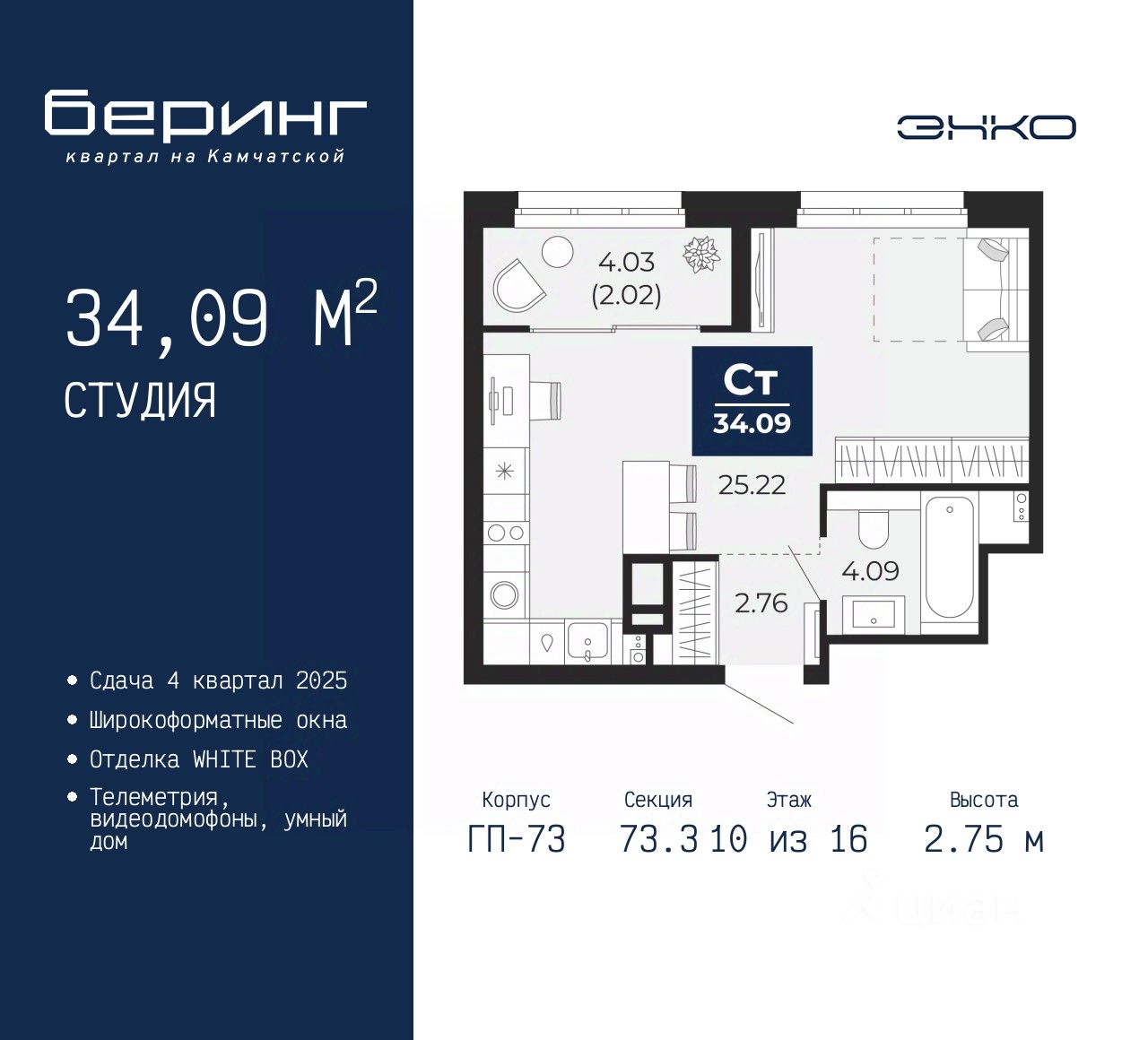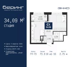 1-комн. квартира-студия от застройщика в ЖК "Беринг" на 10 этаже. Квартира без отделки, полностью готова к чистовой отделке и дальнейшему ремонту. Общая площадь: 34.09 кв.м., площадь гостиной 25.22 кв.м., из которых 5 кв.м. выделено под кухонную зону. Все окна выходят на одну сторону. В квартире один совмещенный санузел. Высота потолков 2.75 м.