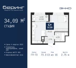 1-комн. квартира-студия в ЖК "Беринг" на 13 этаже. Квартира без отделки, новый владелец может сделать ремонт по индивидуальному проекту. Общая площадь: 34.09 кв.м., площадь гостиной 25.22 кв.м., из которых 5 кв.м. выделено под кухонную зону. Все окна выходят на одну сторону. В квартире один совмещенный санузел. Высота потолков 2.75 м.
