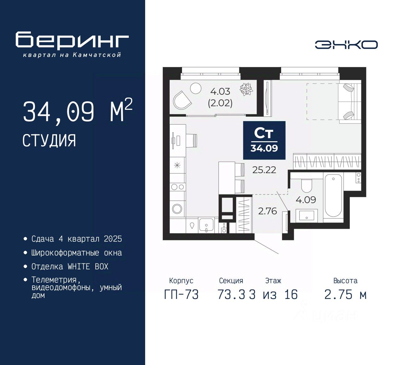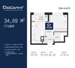 Продается 1-комн. квартира-студия в ЖК "Беринг" на 3 этаже. Квартира без отделки, полностью готова к чистовой отделке и дальнейшему ремонту. Общая площадь: 34.09 кв.м., площадь гостиной 25.22 кв.м., из которых 5 кв.м. выделено под кухонную зону. Все окна выходят на одну сторону. В квартире один совмещенный санузел. Высота потолков 2.75 м.