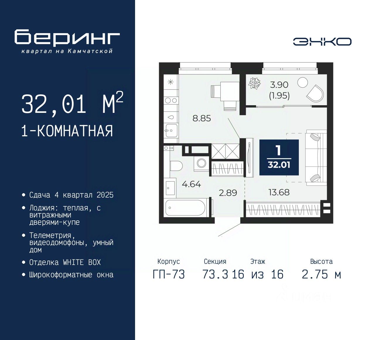Продается 1-комн. квартира от застройщика в ЖК "Беринг" на 16 этаже. Квартира без отделки, новый собственник может сделать ремонт по своему проекту. Общая площадь: 32.01 кв.м., жилая: 13.68 кв.м., площадь кухни: 8.85 кв.м. Все окна выходят на одну сторону. В квартире одна лоджия, один совмещенный санузел. Высота потолков 2.75 м.
