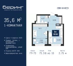 Продается однокомнатная квартира в ЖК "Беринг" на 8 этаже. Квартира без отделки, полностью готова к чистовой отделке и дальнейшему ремонту. Общая площадь: 35.6 кв.м., жилая: 10.11 кв.м., площадь просторной кухни-столовой: 13.89 кв.м. Все окна выходят на одну сторону. В квартире одна лоджия, один совмещенный санузел. Высота потолков 2.75 м.