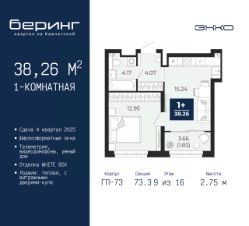 Продается однокомнатная квартира от застройщика в ЖК "Беринг" на 9 этаже. Квартира без отделки, полностью готова к ремонту. Общая площадь: 38.26 кв.м., жилая: 12.95 кв.м., площадь просторной кухни-столовой: 15.48 кв.м. Все окна выходят на одну сторону. В квартире одна лоджия, один совмещенный санузел. Высота потолков 2.75 м.