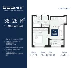 1-комн. квартира в ЖК "Беринг" на 8 этаже. Квартира без отделки, новый собственник может сделать ремонт по индивидуальному проекту. Общая площадь: 38.26 кв.м., жилая: 12.95 кв.м., площадь просторной кухни-столовой: 15.48 кв.м. Все окна выходят на одну сторону. В квартире одна лоджия, один совмещенный санузел. Высота потолков 2.75 м.