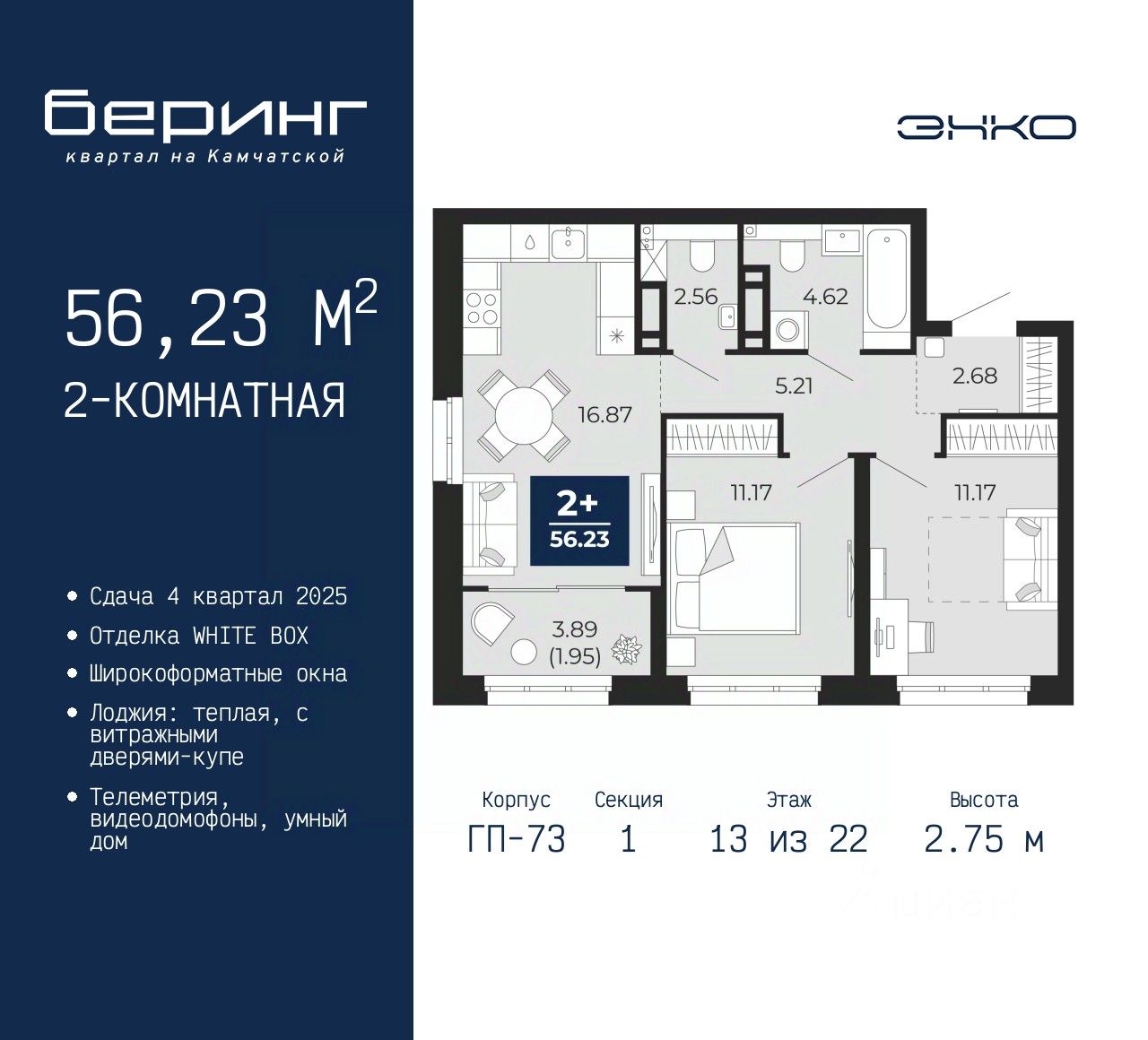 Продается 2-комн. квартира в ЖК "Беринг" на 13 этаже. Квартира без отделки, новый владелец может сделать ремонт по индивидуальному дизайн-проекту. Общая площадь: 56.23 кв.м., жилая: 22.34 кв.м., площадь просторной кухни-столовой: 16.87 кв.м. Угловая квартира, идеально подойдет любителям тишины и панорамных видов. В квартире одна лоджия, один совмещенный и один раздельный санузел. Высота потолков 2.75 м.