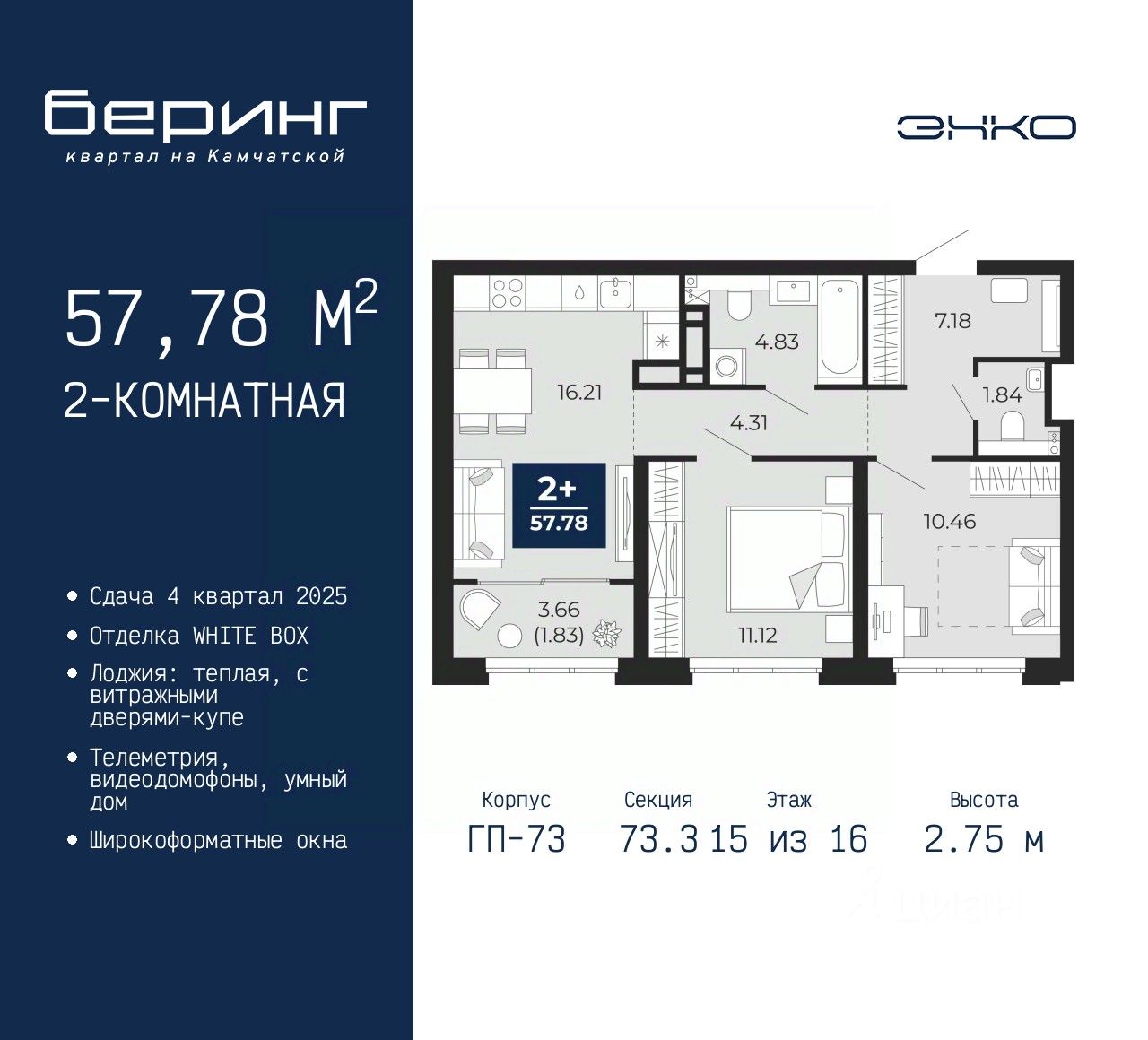 2-комн. квартира от застройщика в ЖК "Беринг" на 15 этаже. Квартира без отделки, полностью готова к чистовой отделке и дальнейшему ремонту. Общая площадь: 57.78 кв.м., жилая: 21.58 кв.м., площадь просторной кухни-столовой: 16.23 кв.м. Комнаты изолированные, все окна выходят на одну сторону. В квартире одна лоджия, один совмещенный и один раздельный санузел. Высота потолков 2.75 м.