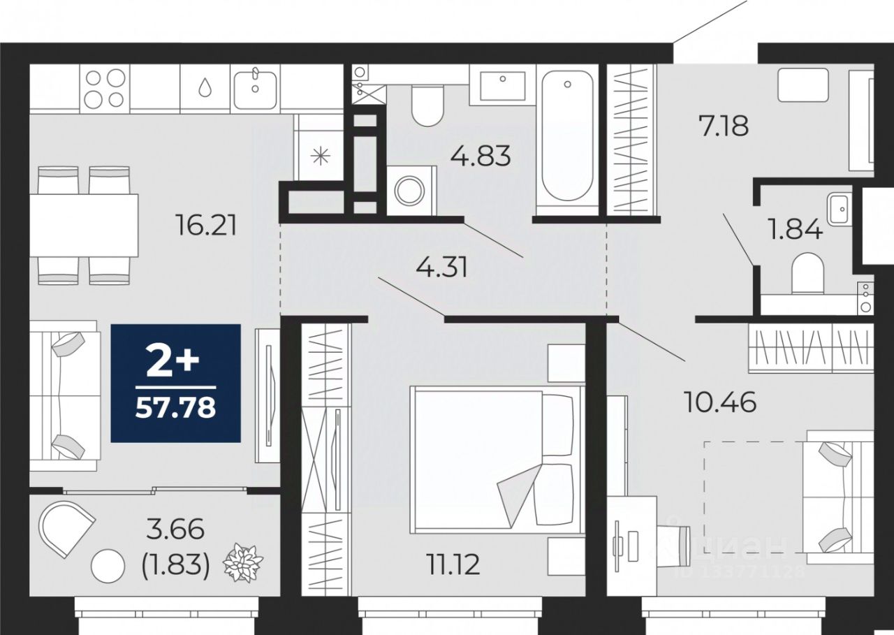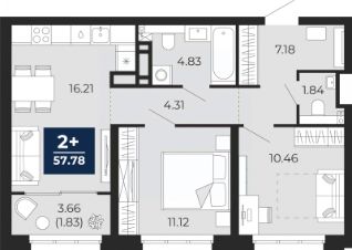 Продается двухкомнатная квартира в ЖК "Беринг" на 13 этаже. Квартира без отделки, новый владелец может сделать ремонт по своему проекту. Общая площадь: 57.78 кв.м., жилая: 21.58 кв.м., площадь просторной кухни-столовой: 16.23 кв.м. Комнаты изолированные, все окна выходят на одну сторону. В квартире одна лоджия, один совмещенный и один раздельный санузел. Высота потолков 2.75 м.