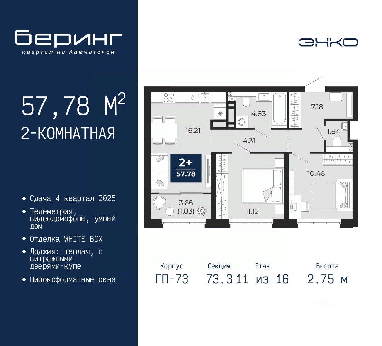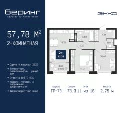 Двухкомнатная квартира от застройщика в ЖК "Беринг" на 11 этаже. Квартира без отделки, новый собственник может сделать ремонт по индивидуальному проекту. Общая площадь: 57.78 кв.м., жилая: 21.58 кв.м., площадь просторной кухни-столовой: 16.23 кв.м. Комнаты изолированные, все окна выходят на одну сторону. В квартире одна лоджия, один совмещенный и один раздельный санузел. Высота потолков 2.75 м.