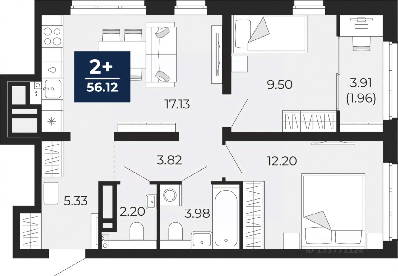 2-комн. квартира в ЖК "Беринг" на 22 этаже. Квартира без отделки, новый собственник может сделать ремонт по своему проекту. Общая площадь: 56.12 кв.м., жилая: 21.7 кв.м., площадь просторной кухни-столовой: 17.13 кв.м. Угловая квартира, очень светлая, естественная вентиляция при открытии окон. В квартире одна лоджия, один совмещенный и один раздельный санузел. Высота потолков 2.75 м.