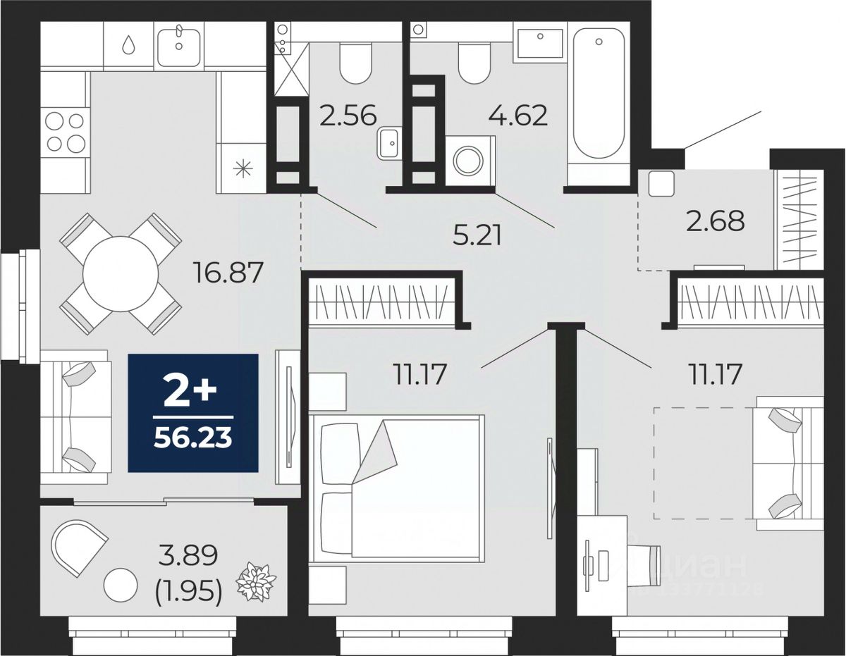 Просторная двухкомнатная квартира в ЖК "Беринг" на 14 этаже. Квартира без отделки, после оформления собственности можно делать ремонт. Общая площадь: 56.23 кв.м., жилая: 22.34 кв.м., площадь просторной кухни-столовой: 16.87 кв.м. Квартира угловая, очень светлая, естественная вентиляция при открытии окон. В квартире одна лоджия, один совмещенный и один раздельный санузел. Высота потолков 2.75 м.