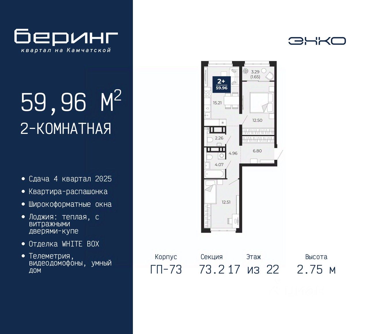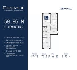 Двухкомнатная квартира от застройщика в ЖК "Беринг" на 17 этаже. Квартира без отделки, полностью готова к чистовой отделке и дальнейшему ремонту. Общая площадь: 59.96 кв.м., жилая: 25.01 кв.м., площадь просторной кухни-столовой: 15.21 кв.м. Квартира - распашонка, без проходных комнат, окна выходят на paзные стороны дома. В квартире одна лоджия, один совмещенный и один раздельный санузел. Высота потолков 2.75 м.