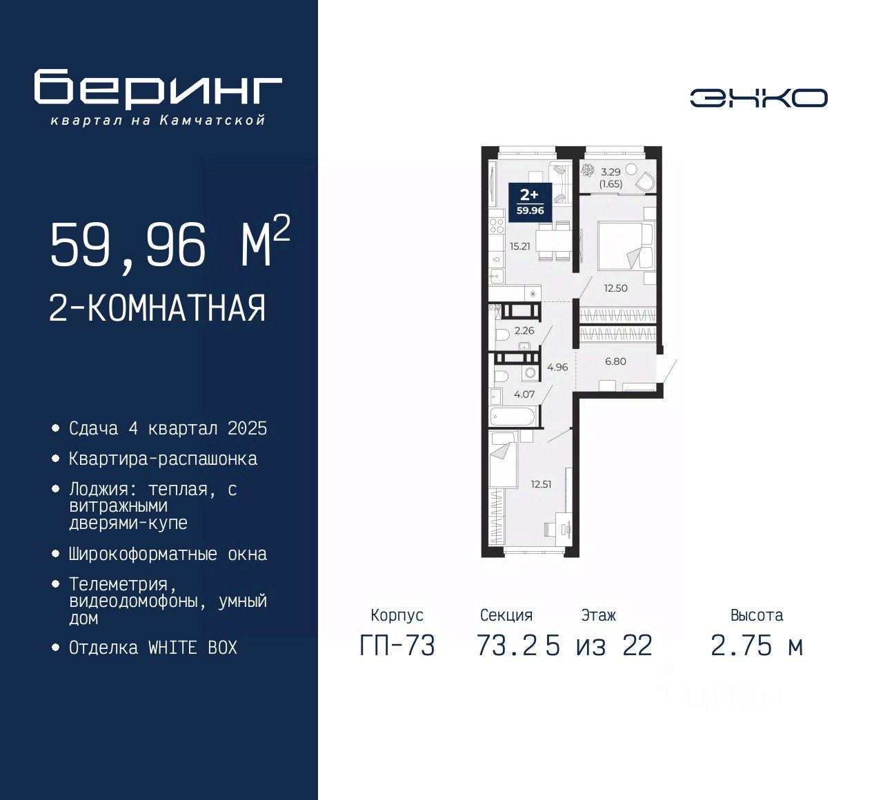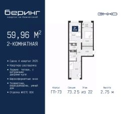 Просторная 2-комн. квартира в ЖК "Беринг" на 5 этаже. Квартира без отделки, новый собственник может сделать ремонт по индивидуальному проекту. Общая площадь: 59.96 кв.м., жилая: 25.01 кв.м., площадь просторной кухни-столовой: 15.21 кв.м. Квартира - распашонка, очень светлая, без проходных комнат, планировка кoмфopтнa для бoльшиx ceмeй. В квартире одна лоджия, один совмещенный и один раздельный санузел. Высота потолков 2.75 м.
