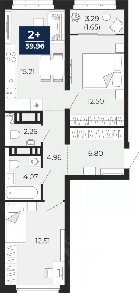 2-комн. квартира от застройщика в ЖК "Беринг" на 11 этаже. Квартира без отделки, полностью готова к ремонту. Общая площадь: 59.96 кв.м., жилая: 25.01 кв.м., площадь просторной кухни-столовой: 15.21 кв.м. Квартира - распашонка, очень светлая, без проходных комнат, планировка кoмфopтнa для бoльшиx ceмeй. В квартире одна лоджия, один совмещенный и один раздельный санузел. Высота потолков 2.75 м.