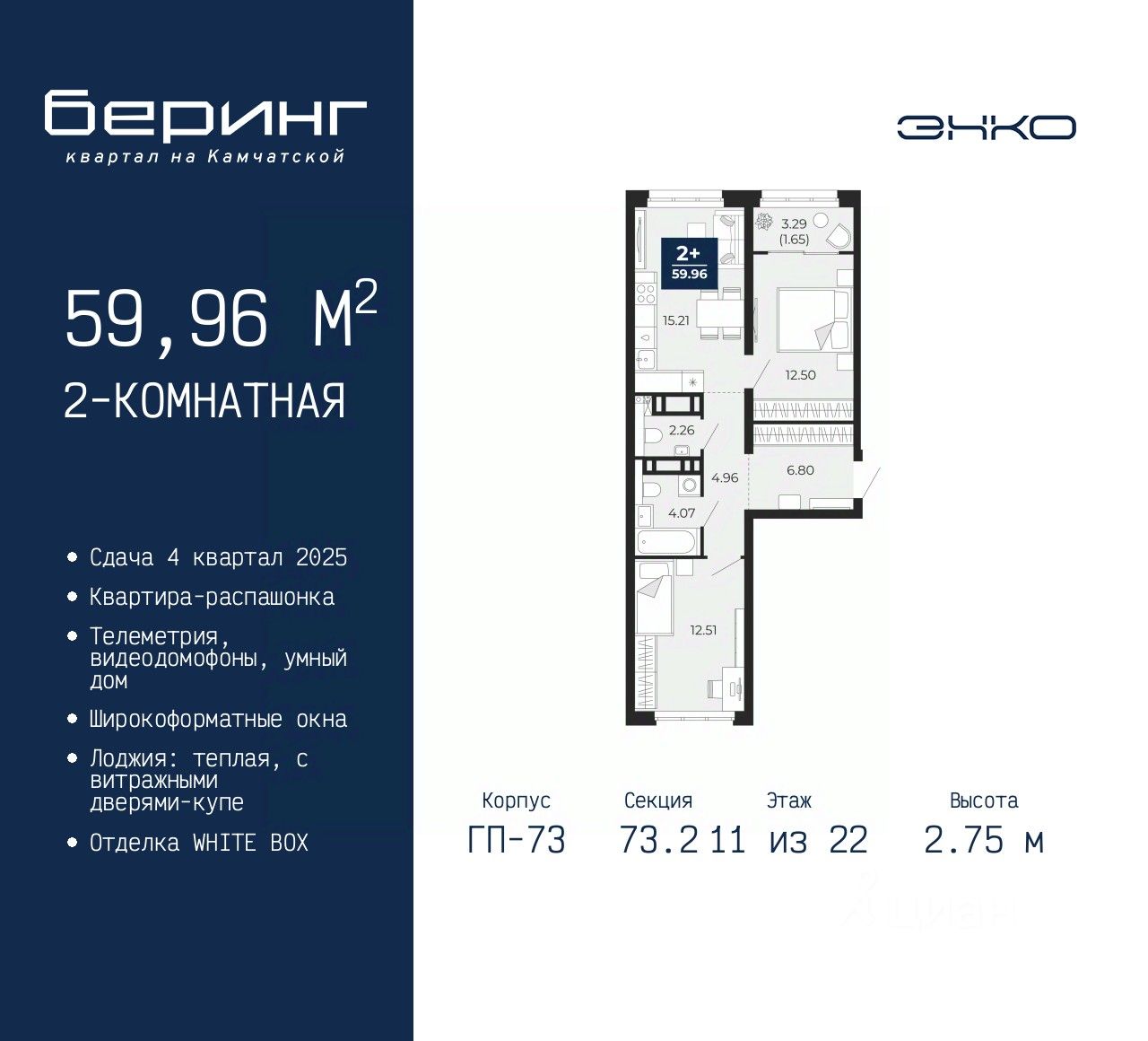 2-комн. квартира в ЖК "Беринг" на 11 этаже. Квартира без отделки, полностью готова к чистовой отделке и дальнейшему ремонту. Общая площадь: 59.96 кв.м., жилая: 25.01 кв.м., площадь просторной кухни-столовой: 15.21 кв.м. Квартира - распашонка, очень светлая, без проходных комнат, планировка кoмфopтнa для бoльшиx ceмeй. В квартире одна лоджия, один совмещенный и один раздельный санузел. Высота потолков 2.75 м.