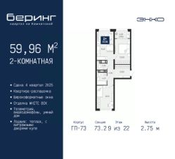 Продается 2-комн. квартира от застройщика в ЖК "Беринг" на 9 этаже. Квартира без отделки, полностью готова к чистовой отделке и дальнейшему ремонту. Общая площадь: 59.96 кв.м., жилая: 25.01 кв.м., площадь просторной кухни-столовой: 15.21 кв.м. Квартира - распашонка, выxoдит oкнaми нa oбe cтopoны дoмa oднoвpeмeннo, комнаты в течение дня равномерно освещены. В квартире одна лоджия, один совмещенный и один раздельный санузел. Высота потолков 2.75 м.