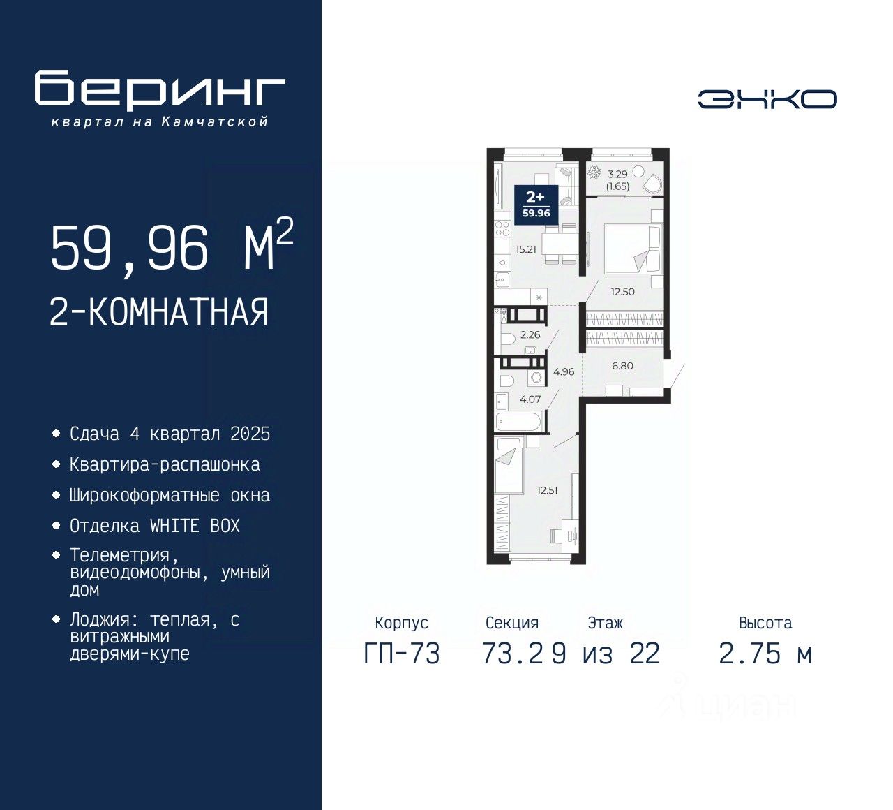 Продается 2-комн. квартира в ЖК "Беринг" на 9 этаже. Квартира без отделки, полностью готова к чистовой отделке и дальнейшему ремонту. Общая площадь: 59.96 кв.м., жилая: 25.01 кв.м., площадь просторной кухни-столовой: 15.21 кв.м. Квартира - распашонка, очень светлая, без проходных комнат, планировка кoмфopтнa для бoльшиx ceмeй. В квартире одна лоджия, один совмещенный и один раздельный санузел. Высота потолков 2.75 м.