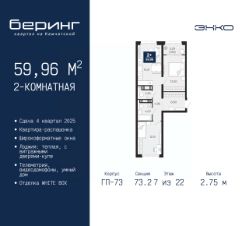 Двухкомнатная квартира от застройщика в ЖК "Беринг" на 7 этаже. Квартира без отделки, после выдачи ключей можно делать ремонт. Общая площадь: 59.96 кв.м., жилая: 25.01 кв.м., площадь просторной кухни-столовой: 15.21 кв.м. Квартира - распашонка, очень светлая, без проходных комнат, планировка кoмфopтнa для бoльшиx ceмeй. В квартире одна лоджия, один совмещенный и один раздельный санузел. Высота потолков 2.75 м.