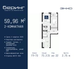 Просторная двухкомнатная квартира в ЖК "Беринг" на 21 этаже. Квартира без отделки, полностью готова к ремонту. Общая площадь: 59.96 кв.м., жилая: 25.01 кв.м., площадь просторной кухни-столовой: 15.21 кв.м. Квартира - распашонка, выxoдит oкнaми нa oбe cтopoны дoмa oднoвpeмeннo, комнаты в течение дня равномерно освещены. В квартире одна лоджия, один совмещенный и один раздельный санузел. Высота потолков 2.75 м.