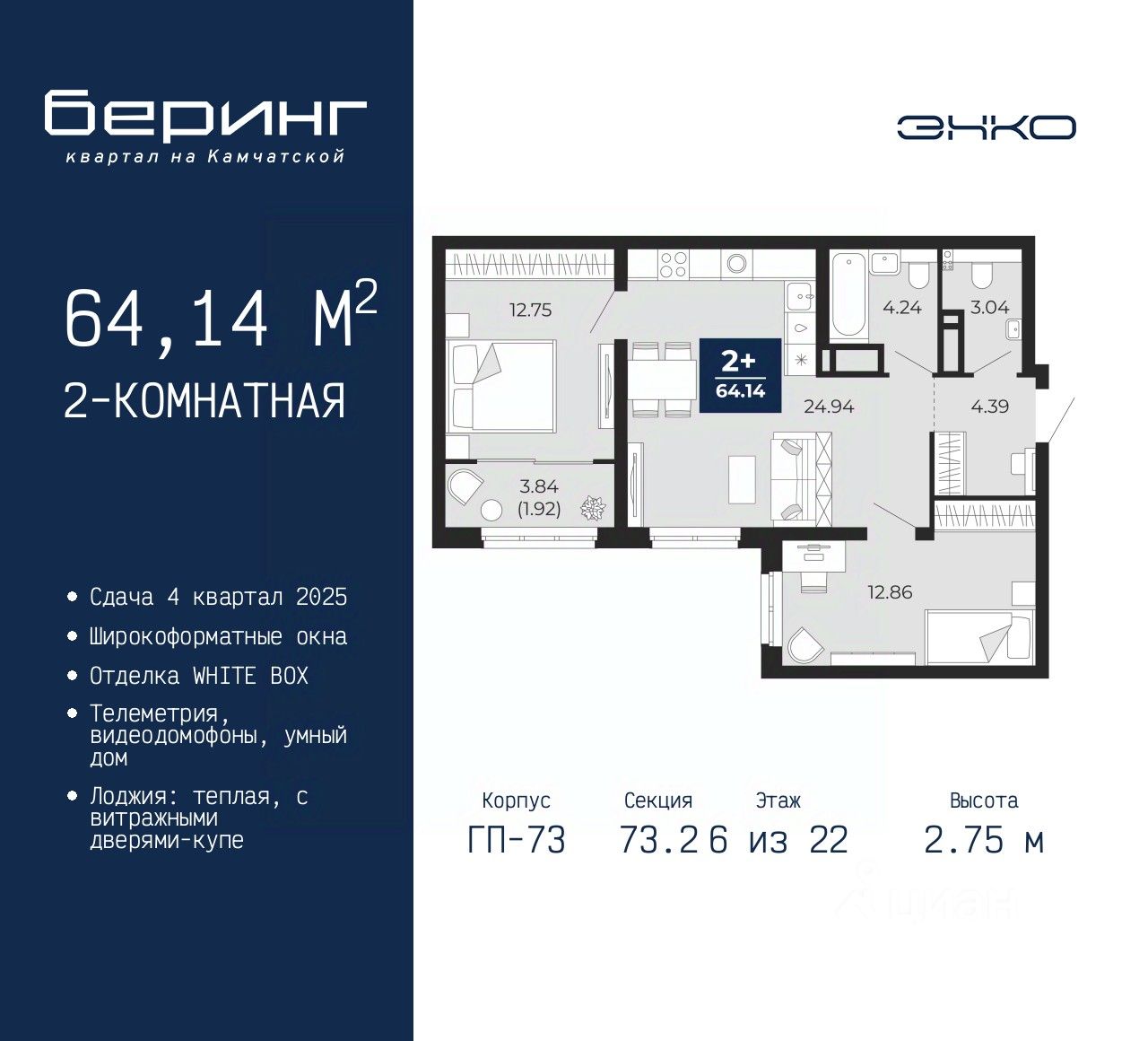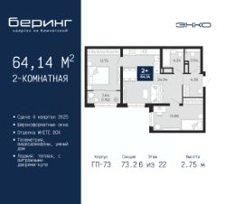 Продается двухкомнатная квартира в ЖК "Беринг" на 6 этаже. Квартира без отделки, полностью готова к ремонту. Общая площадь: 64.14 кв.м., жилая: 25.61 кв.м., площадь просторной кухни-столовой: 24.94 кв.м. Квартира угловая, окна oбecпeчивaют paвнoмepнoe ocвeщeниe в тeчeниe дня. В квартире одна лоджия, один совмещенный и один раздельный санузел. Высота потолков 2.75 м.