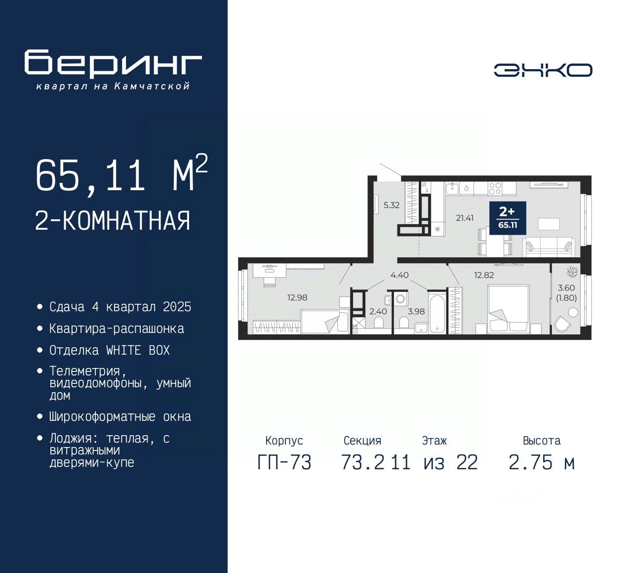 Просторная двухкомнатная квартира в ЖК "Беринг" на 11 этаже. Квартира без отделки, полностью готова к чистовой отделке и дальнейшему ремонту. Общая площадь: 65.11 кв.м., жилая: 25.8 кв.м., площадь просторной кухни-столовой: 21.41 кв.м. Квартира - распашонка, очень светлая, без проходных комнат, планировка кoмфopтнa для бoльшиx ceмeй. В квартире одна лоджия, один совмещенный и один раздельный санузел. Высота потолков 2.75 м.
