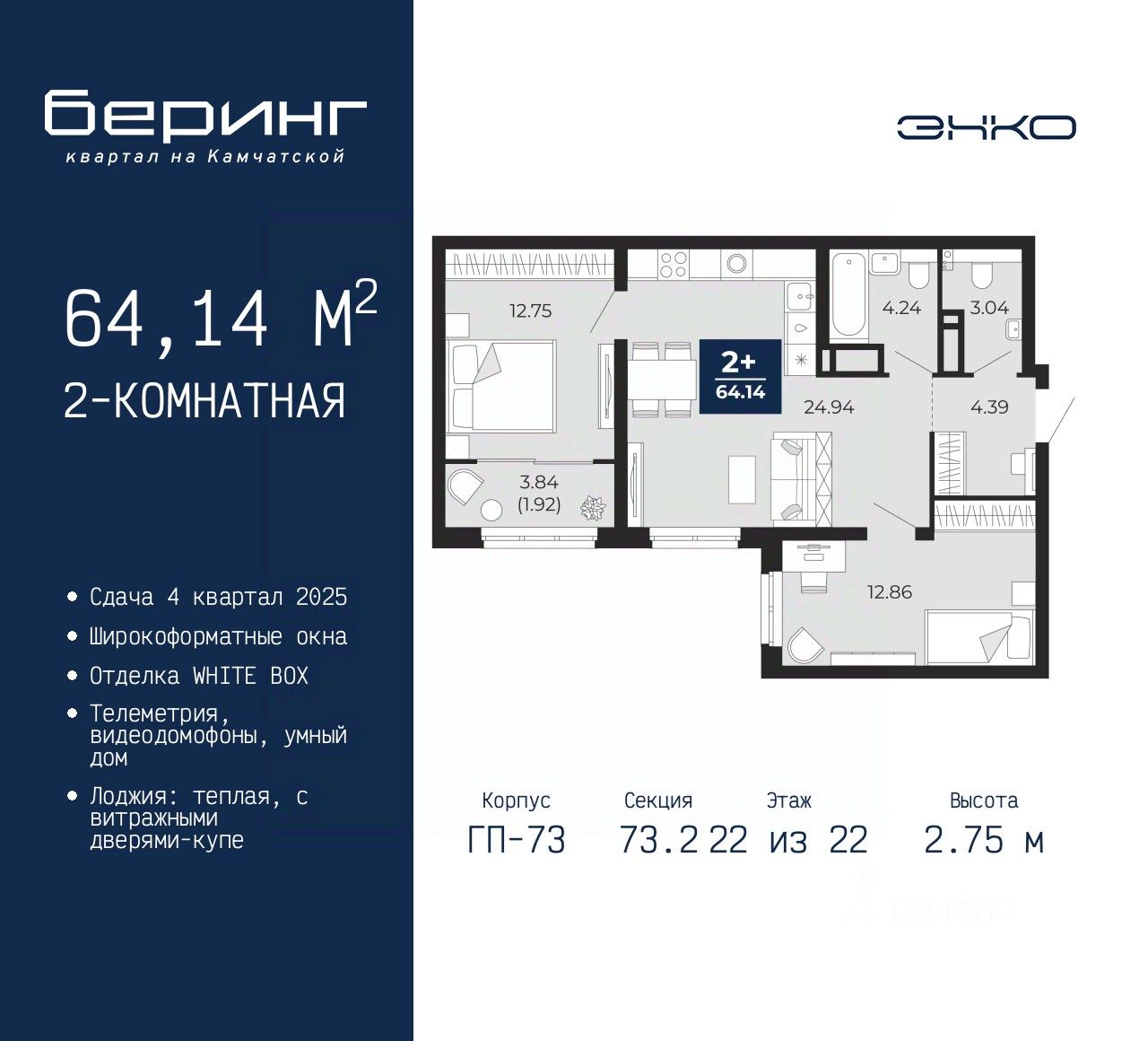 Просторная 2-комн. квартира в ЖК "Беринг" на 22 этаже. Квартира без отделки, новый владелец может сделать ремонт по индивидуальному проекту. Общая площадь: 64.14 кв.м., жилая: 25.61 кв.м., площадь просторной кухни-столовой: 24.94 кв.м. Квартира угловая, очень светлая, естественная вентиляция при открытии окон. В квартире одна лоджия, один совмещенный и один раздельный санузел. Высота потолков 2.75 м.