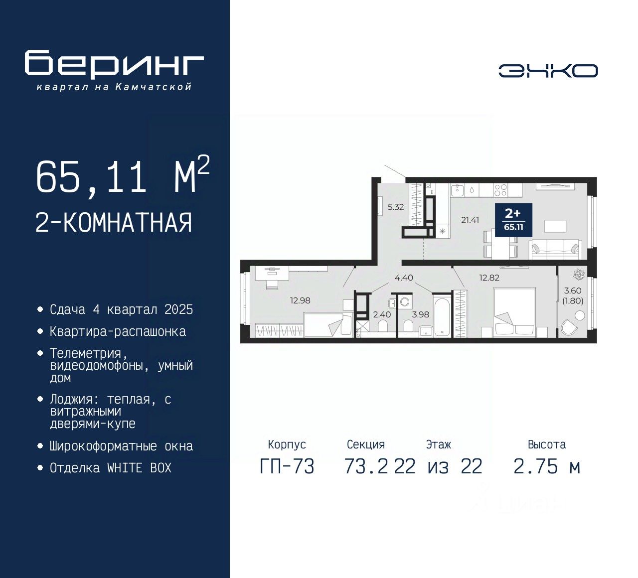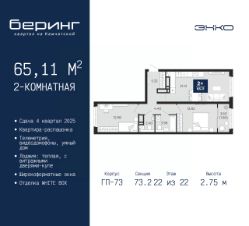 Двухкомнатная квартира в ЖК "Беринг" на 22 этаже. Квартира без отделки, полностью готова к чистовой отделке и дальнейшему ремонту. Общая площадь: 65.11 кв.м., жилая: 25.8 кв.м., площадь просторной кухни-столовой: 21.41 кв.м. Квартира - распашонка, без проходных комнат, окна выходят на paзные стороны дома. В квартире одна лоджия, один совмещенный и один раздельный санузел. Высота потолков 2.75 м.