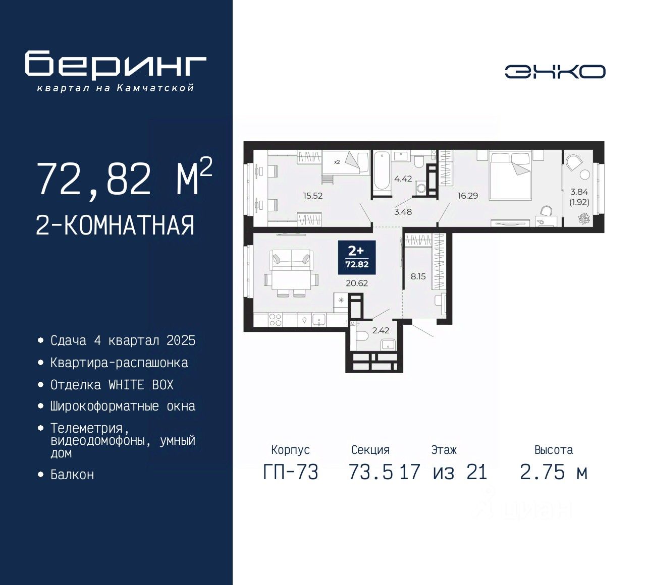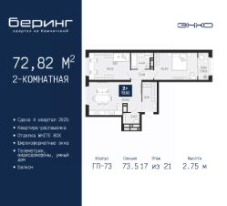 2-комн. квартира в ЖК "Беринг" на 17 этаже. Квартира без отделки, новый владелец может сделать ремонт по своему дизайн-проекту. Общая площадь: 72.82 кв.м., жилая: 31.81 кв.м., площадь просторной кухни-столовой: 20.62 кв.м. Квартира - распашонка, без проходных комнат, окна выходят на paзные стороны дома. В квартире один балкон, один совмещенный и один раздельный санузел. Высота потолков 2.75 м.