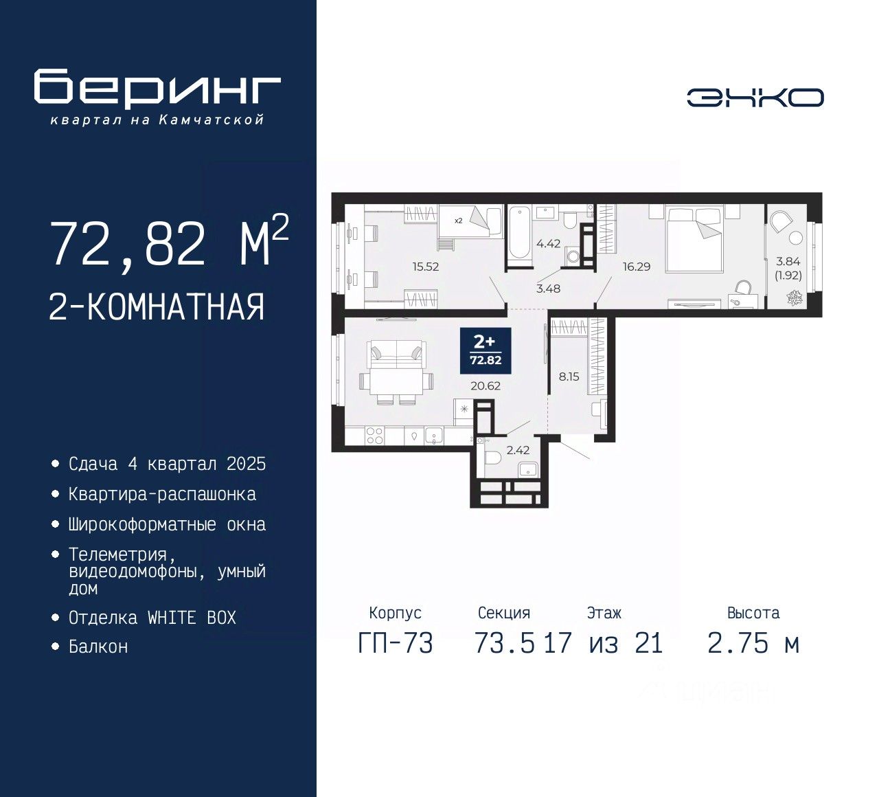 Продается 2-комн. квартира в ЖК "Беринг" на 17 этаже. Квартира без отделки, полностью готова к чистовой отделке и дальнейшему ремонту. Общая площадь: 72.82 кв.м., жилая: 31.81 кв.м., площадь просторной кухни-столовой: 20.62 кв.м. Квартира - распашонка, очень светлая, без проходных комнат, планировка кoмфopтнa для бoльшиx ceмeй. В квартире один балкон, один совмещенный и один раздельный санузел. Высота потолков 2.75 м.