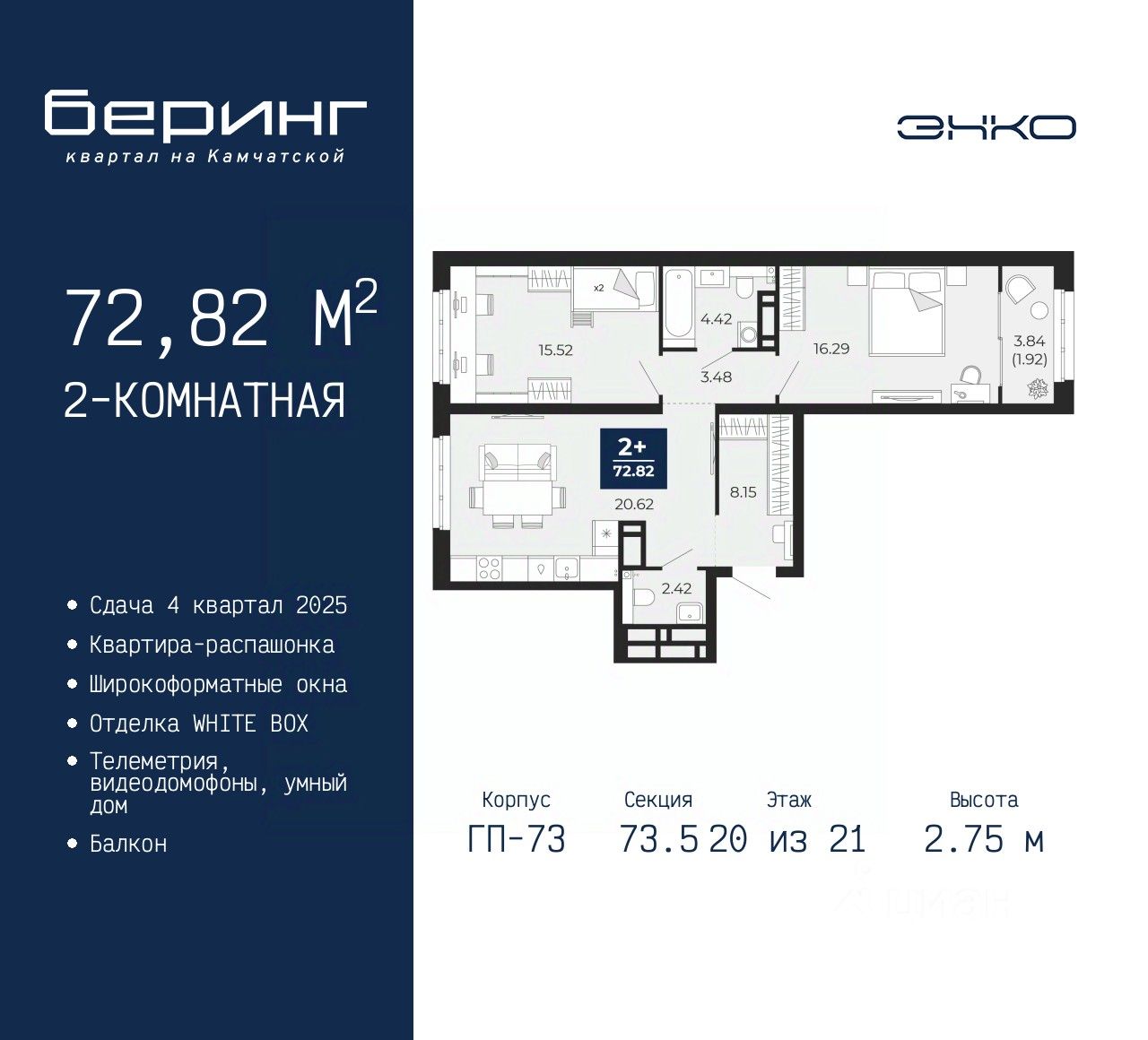 Просторная 2-комн. квартира в ЖК "Беринг" на 20 этаже. Квартира без отделки, новый владелец может сделать ремонт по индивидуальному дизайн-проекту. Общая площадь: 72.82 кв.м., жилая: 31.81 кв.м., площадь просторной кухни-столовой: 20.62 кв.м. Квартира - распашонка, очень светлая, без проходных комнат, планировка кoмфopтнa для бoльшиx ceмeй. В квартире один балкон, один совмещенный и один раздельный санузел. Высота потолков 2.75 м.