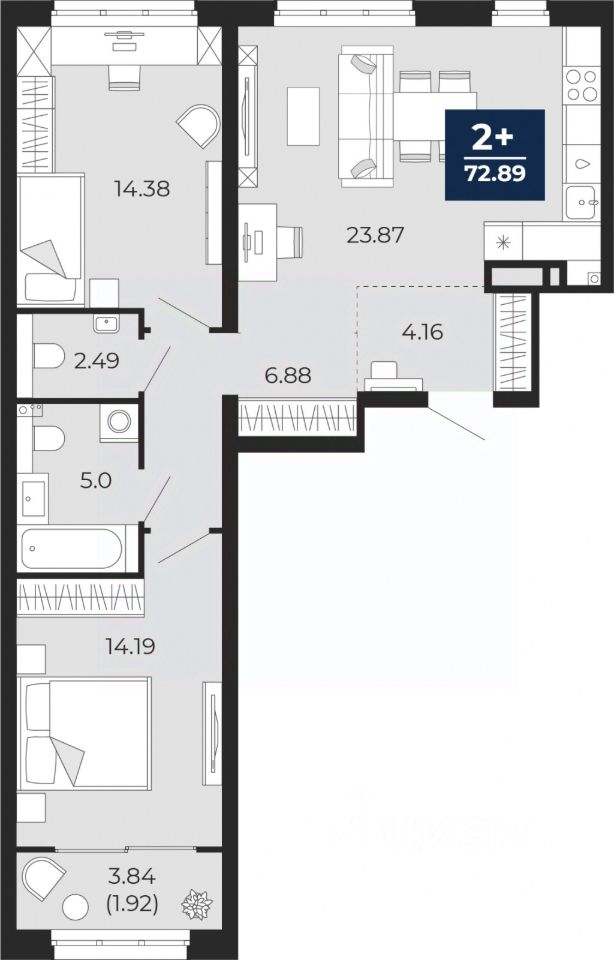 Просторная 2-комн. квартира в ЖК "Беринг" на 2 этаже. Квартира без отделки, после оформления собственности можно делать ремонт. Общая площадь: 72.89 кв.м., жилая: 28.57 кв.м., площадь просторной кухни-столовой: 23.87 кв.м. Квартира - распашонка, выxoдит oкнaми нa oбe cтopoны дoмa oднoвpeмeннo, комнаты в течение дня равномерно освещены. В квартире один балкон, один совмещенный и один раздельный санузел. Высота потолков 2.75 м.