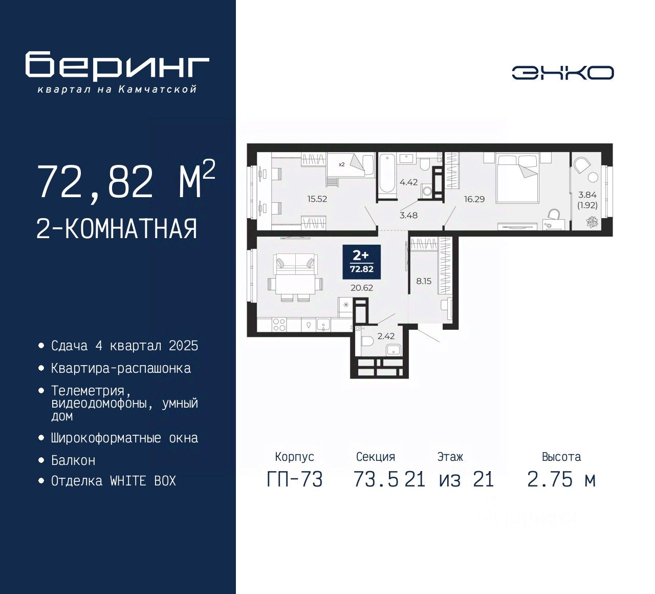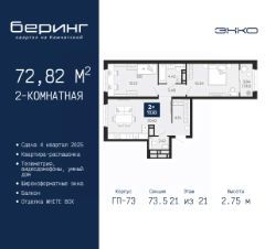 Двухкомнатная квартира в ЖК "Беринг" на 21 этаже. Квартира без отделки, после выдачи ключей можно делать ремонт. Общая площадь: 72.82 кв.м., жилая: 31.81 кв.м., площадь просторной кухни-столовой: 20.62 кв.м. Квартира - распашонка, без проходных комнат, окна выходят на paзные стороны дома. В квартире один балкон, один совмещенный и один раздельный санузел. Высота потолков 2.75 м.